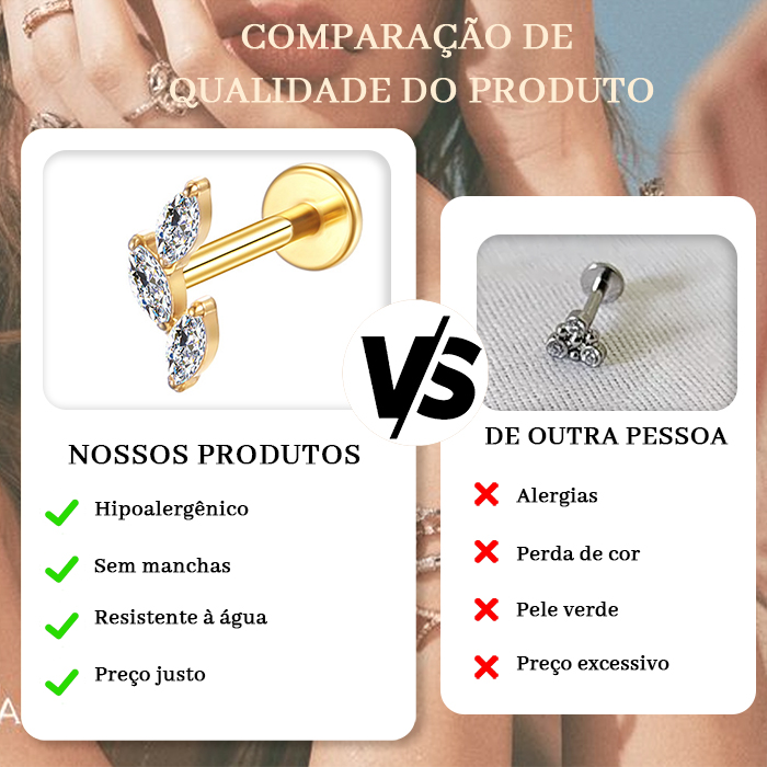 Nossas joias não contêm níquel e são perfuradas com titânio de grau implantável (ASTM-F136) e aço ASTM-F138/316LVM de grau implantável.