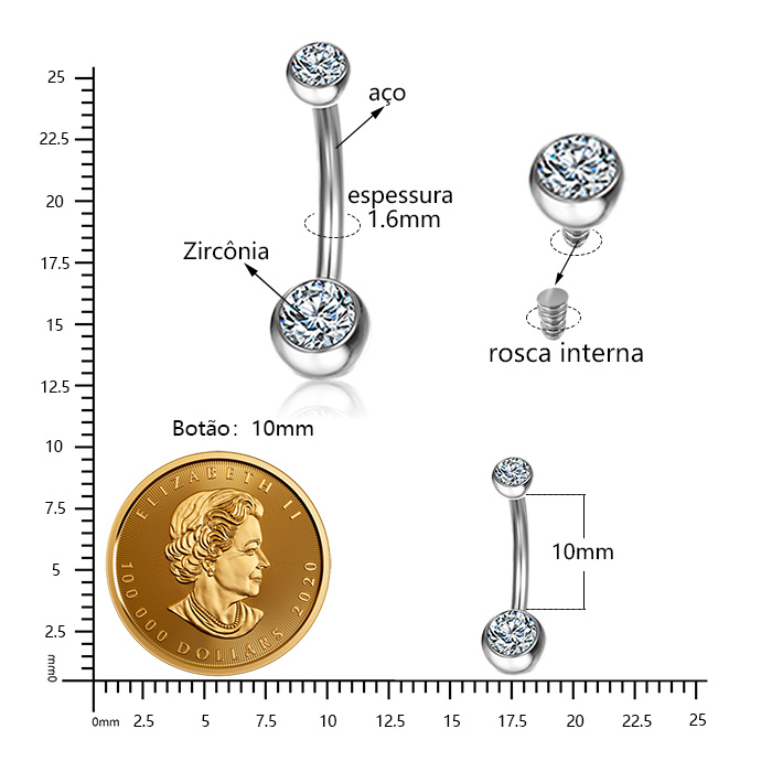 Este piercing de umbigo combina aço cirúrgico de alta qualidade com banana de titânio e 2 pedras zircônia, oferecendo um visual sofisticado e moderno. Disponível em espessura de 1.6mm e comprimento de 10mm, é a escolha ideal para quem ama detalhes brilhantes e duráveis.